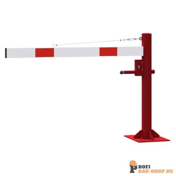 Schake Drehschranke mit Seilzugverstärkung, für Dübelbefestigung, feuerverzinkt und rot beschichtet mit weiß reflektierenden Ringen, Schrankenbaumlänge: 1500 mm, mit Profilzylinde