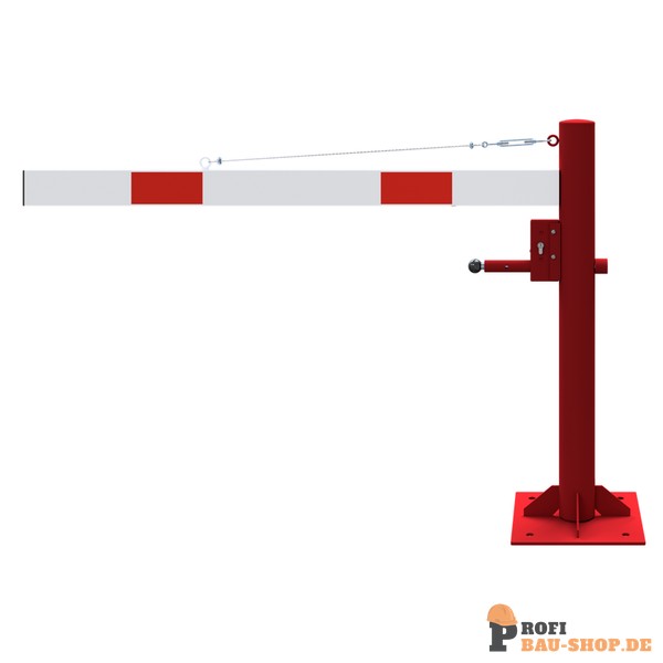 Technische Daten Drehschranke mit Seilzugverstärkung, für Dübelbefestigung, feuerverzinkt und rot beschichtet mit weiß reflektierenden Ringen, Schrankenbaumlänge: 1500 mm, mit Profilzylinderschloss