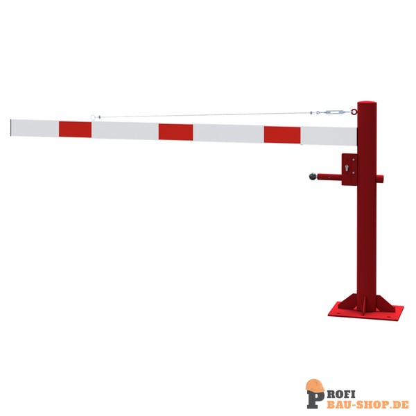 Technische Daten Drehschranke mit Seilzugverstärkung, für Dübelbefestigung, feuerverzinkt und rot beschichtet mit weiß reflektierenden Ringen, Schrankenbaumlänge: 2000 mm, mit Profilzylinderschloss