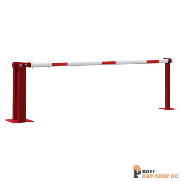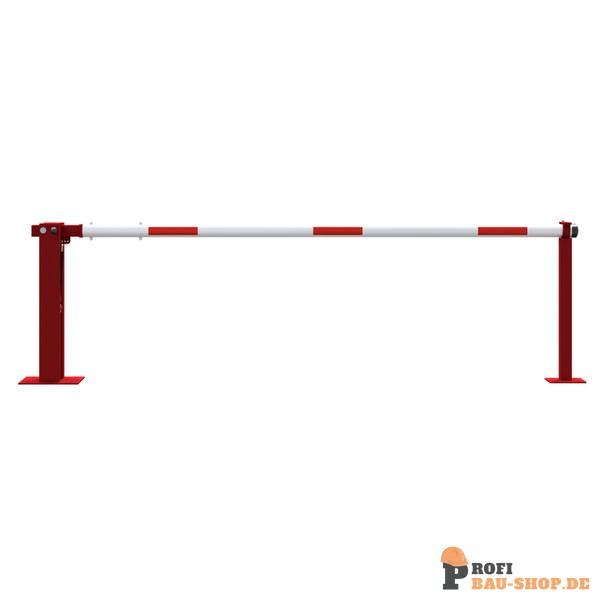 Handschranke mit Gasdruckfeder und festem Auflagepfosten Hauptstütze: Stahlkonstruktion 120 x 80 mm Rechteckrohr mit Bodenplatte 360 x 360 x 8 mm zum Aufdübeln, inkl. 4 Bohrungen Ø 20 mm für Anker, feuerverzinkt und rot pulverbeschichtet, Arretierung durch Bolzen bei geöffneter und geschlossener Schranke Auflagepfosten: Stahlrohr 70 x 70 mm mit Bodenplatte 220 x 220 x 8 mm, inkl. 4 Bohrungen Ø 20 mm für Anker Schrankenbaum: starkwandiges Ø 80 mm Aluminiumrohr, pulverbeschichtet mit rot refl. Streifen Verschluss am Auflagepfosten Gesamtbreite: lichte Weite + ca. 180 mm Höhe: ca. 950 mm Überflur Empfehlung: Seilzugverstärkung ab einer Sperrbreite von 6 m für zusätzliche Stabilität.