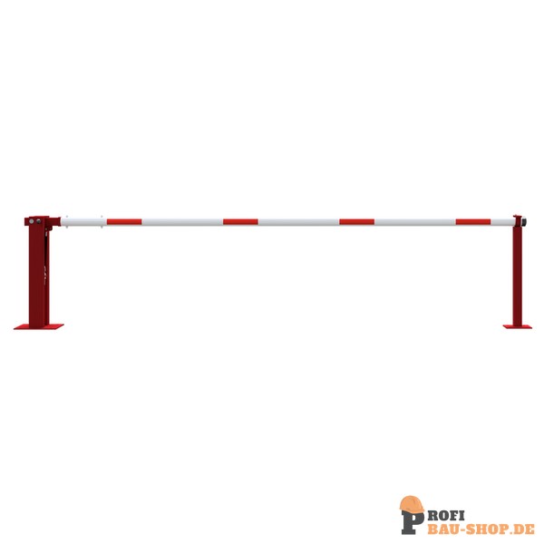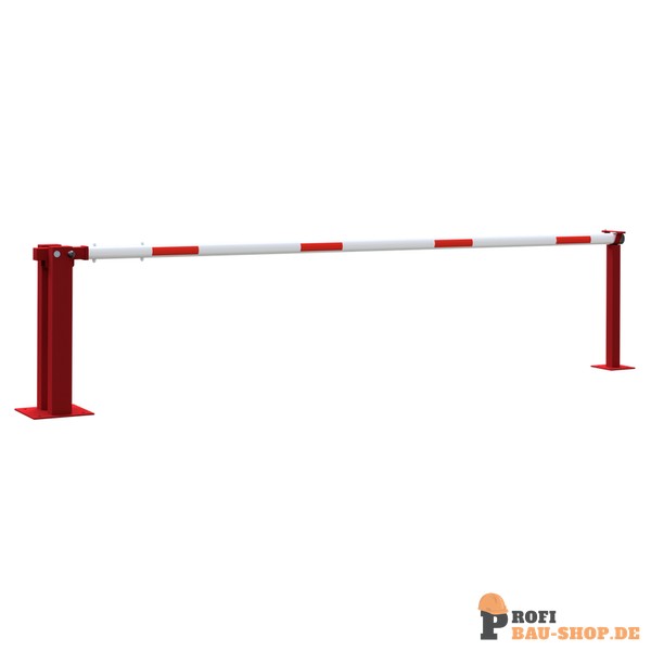 Handschranke mit Gasdruckfeder und festem Auflagepfosten Hauptstütze: Stahlkonstruktion 120 x 80 mm Rechteckrohr mit Bodenplatte 360 x 360 x 8 mm zum Aufdübeln, inkl. 4 Bohrungen Ø 20 mm für Anker, feuerverzinkt und rot pulverbeschichtet, Arretierung durch Bolzen bei geöffneter und geschlossener Schranke Auflagepfosten: Stahlrohr 70 x 70 mm mit Bodenplatte 220 x 220 x 8 mm, inkl. 4 Bohrungen Ø 20 mm für Anker Schrankenbaum: starkwandiges Ø 80 mm Aluminiumrohr, pulverbeschichtet mit rot refl. Streifen Verschluss am Auflagepfosten Gesamtbreite: lichte Weite + ca. 180 mm Höhe: ca. 950 mm Überflur Empfehlung: Seilzugverstärkung ab einer Sperrbreite von 6 m für zusätzliche Stabilität.