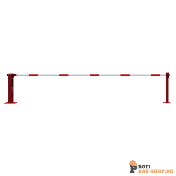 Handschranke mit Gasdruckfeder und festem Auflagepfosten Hauptstütze: Stahlkonstruktion 120 x 80 mm Rechteckrohr mit Bodenplatte 360 x 360 x 8 mm zum Aufdübeln, inkl. 4 Bohrungen Ø 20 mm für Anker, feuerverzinkt und rot pulverbeschichtet, Arretierung durch Bolzen bei geöffneter und geschlossener Schranke Auflagepfosten: Stahlrohr 70 x 70 mm mit Bodenplatte 220 x 220 x 8 mm, inkl. 4 Bohrungen Ø 20 mm für Anker Schrankenbaum: starkwandiges Ø 80 mm Aluminiumrohr, pulverbeschichtet mit rot refl. Streifen Verschluss am Auflagepfosten Gesamtbreite: lichte Weite + ca. 180 mm Höhe: ca. 950 mm Überflur Empfehlung: Seilzugverstärkung ab einer Sperrbreite von 6 m für zusätzliche Stabilität.