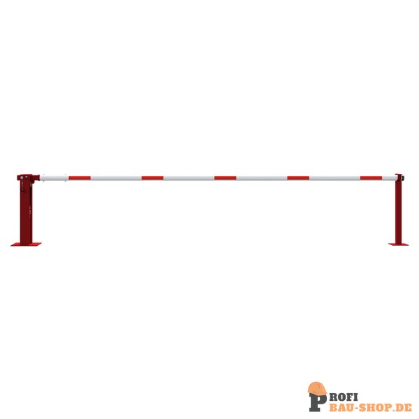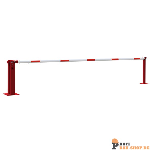 Handschranke mit Gasdruckfeder und festem Auflagepfosten Hauptstütze: Stahlkonstruktion 120 x 80 mm Rechteckrohr mit Bodenplatte 360 x 360 x 8 mm zum Aufdübeln, inkl. 4 Bohrungen Ø 20 mm für Anker, feuerverzinkt und rot pulverbeschichtet, Arretierung durch Bolzen bei geöffneter und geschlossener Schranke Auflagepfosten: Stahlrohr 70 x 70 mm mit Bodenplatte 220 x 220 x 8 mm, inkl. 4 Bohrungen Ø 20 mm für Anker Schrankenbaum: starkwandiges Ø 80 mm Aluminiumrohr, pulverbeschichtet mit rot refl. Streifen Verschluss am Auflagepfosten Gesamtbreite: lichte Weite + ca. 180 mm Höhe: ca. 950 mm Überflur Empfehlung: Seilzugverstärkung ab einer Sperrbreite von 6 m für zusätzliche Stabilität.