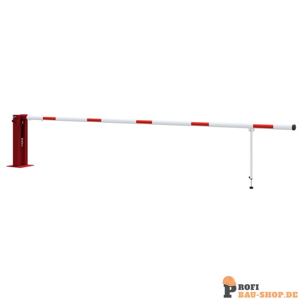 Handschranke mit Gasdruckfeder und Pendelstütze Hauptstütze: Stahlkonstruktion 120 x 80 mm Rechteckrohr mit Bodenplatte 360 x 360 x 8 mm zum Aufdübeln, inkl. 4 Bohrungen Ø 20 mm für Anker, feuerverzinkt und rot pulverbeschichtet, Arretierung durch Bolzen bei geöffneter und geschlossener Schranke Pendelstütze: Aluminiumrohr mit Ausgleichsfuß Schrankenbaum: starkwandiges Ø 80 mm Aluminiumrohr, pulverbeschichtet mit rot refl. Streifen Verschluss an der Hauptstütze Gesamtbreite: lichte Weite + ca. 180 mm