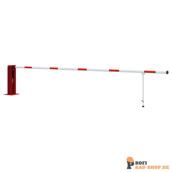 Handschranke mit Gasdruckfeder und Pendelstütze Hauptstütze: Stahlkonstruktion 120 x 80 mm Rechteckrohr mit Bodenplatte 360 x 360 x 8 mm zum Aufdübeln, inkl. 4 Bohrungen Ø 20 mm für Anker, feuerverzinkt und rot pulverbeschichtet, Arretierung durch Bolzen bei geöffneter und geschlossener Schranke Pendelstütze: Aluminiumrohr mit Ausgleichsfuß Schrankenbaum: starkwandiges Ø 80 mm Aluminiumrohr, pulverbeschichtet mit rot refl. Streifen Verschluss an der Hauptstütze Gesamtbreite: lichte Weite + ca. 180 mm