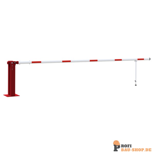 Handschranke mit Gasdruckfeder und Pendelstütze Hauptstütze: Stahlkonstruktion 120 x 80 mm Rechteckrohr mit Bodenplatte 360 x 360 x 8 mm zum Aufdübeln, inkl. 4 Bohrungen Ø 20 mm für Anker, feuerverzinkt und rot pulverbeschichtet, Arretierung durch Bolzen bei geöffneter und geschlossener Schranke Pendelstütze: Aluminiumrohr mit Ausgleichsfuß Schrankenbaum: starkwandiges Ø 80 mm Aluminiumrohr, pulverbeschichtet mit rot refl. Streifen Verschluss an der Hauptstütze Gesamtbreite: lichte Weite + ca. 180 mm
