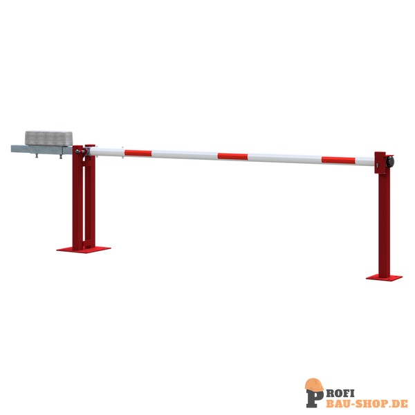 Wegeschranke Hauptstütze: Stahlkonstruktion 70 x 70 mm Vierkantrohr mit Bodenplatte 360 x 360 x 8 mm zum Aufdübeln, inkl. 4 Bohrungen Ø 20 mm für Anker, feuerverzinkt und rot pulverbeschichtet Auflagepfosten: Stahlrohr 70 x 70 mm mit Bodenplatte 220 x 220 x 8 mm inkl. 4 Bohrungen Ø 20 mm für Anker Schrankenbaum: starkwandiges Ø 80 mm Aluminiumrohr mit Gegengewicht, unbeschichtet mit weiß/rot reflektierenden Streifen Verschluss: an der Auflagestütze Arretierung, bei geöffneter Schranke mit Steckbolzen an der Hauptstütze Gesamtbreite: lichte Weite + ca. 900 mm Höhe: ca. 950 mm Überflur