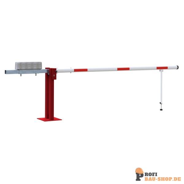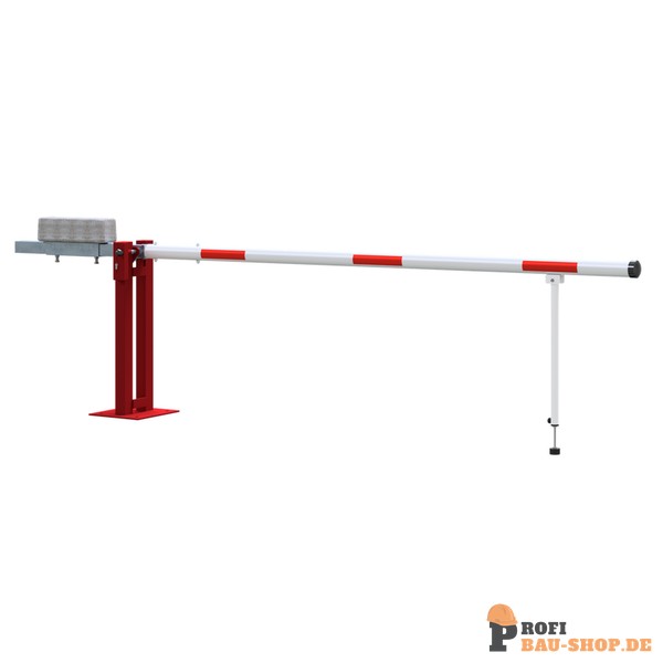 Wegeschranke Hauptstütze: Stahlkonstruktion 70 x 70 mm Vierkantrohr mit Bodenplatte 360 x 360 x 8 mm zum Aufdübeln, inkl. 4 Bohrungen Ø 20 mm für Anker, feuerverzinkt und rot pulverbeschichtet Schrankenbaum: starkwandiges Ø 80 mm Aluminiumrohr mit Gegengewicht, unbeschichtet mit weiß/rot reflektiere