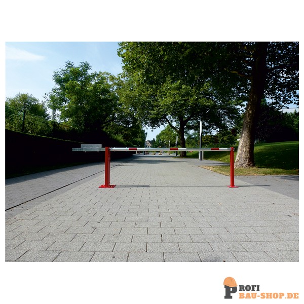 Wegeschranke Hauptstütze: Stahlkonstruktion 70 x 70 mm Vierkantrohr mit Bodenplatte 360 x 360 x 8 mm zum Aufdübeln, inkl. 4 Bohrungen Ø 20 mm für Anker, feuerverzinkt und rot pulverbeschichtet Auflagepfosten: Stahlrohr 70 x 70 mm mit Bodenplatte 220 x 220 x 8 mm inkl. 4 Bohrungen Ø 20 mm für Anker Schrankenbaum: starkwandiges Ø 80 mm Aluminiumrohr mit Gegengewicht, unbeschichtet mit weiß/rot reflektierenden Streifen Verschluss: an der Auflagestütze Arretierung, bei geöffneter Schranke mit Steckbolzen an der Hauptstütze Gesamtbreite: lichte Weite + ca. 900 mm Höhe: ca. 950 mm Überflur