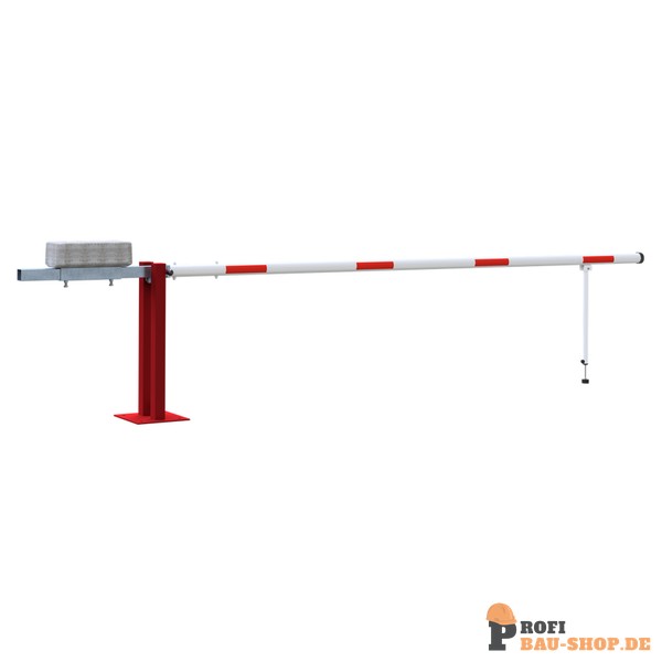 Wegeschranke Hauptstütze: Stahlkonstruktion 70 x 70 mm Vierkantrohr mit Bodenplatte 360 x 360 x 8 mm zum Aufdübeln, inkl. 4 Bohrungen Ø 20 mm für Anker, feuerverzinkt und rot pulverbeschichtet Schrankenbaum: starkwandiges Ø 80 mm Aluminiumrohr mit Gegengewicht, unbeschichtet mit weiß/rot reflektiere