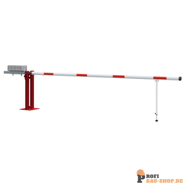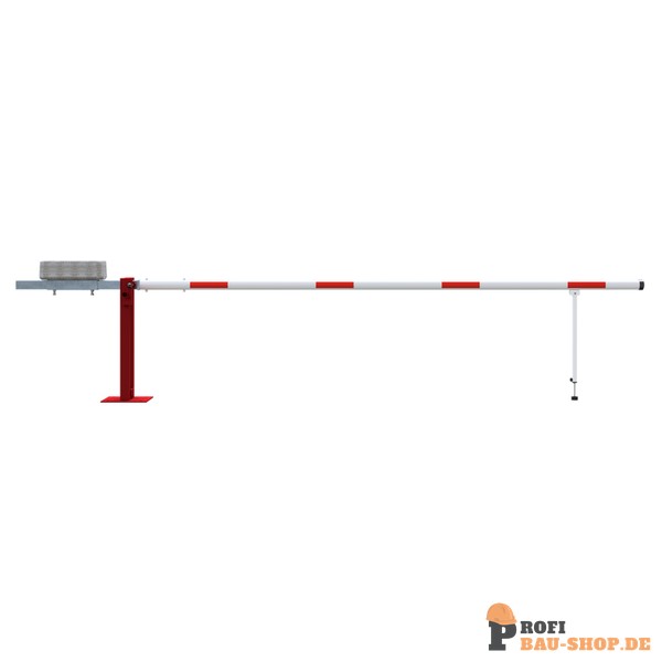 Wegeschranke Hauptstütze: Stahlkonstruktion 70 x 70 mm Vierkantrohr mit Bodenplatte 360 x 360 x 8 mm zum Aufdübeln, inkl. 4 Bohrungen Ø 20 mm für Anker, feuerverzinkt und rot pulverbeschichtet Schrankenbaum: starkwandiges Ø 80 mm Aluminiumrohr mit Gegengewicht, unbeschichtet mit weiß/rot reflektierenden Streifen Pendelstütze: Aluminiumrohr mit Ausgleichsfuß Verschluss: an der Hauptstütze mit Steckbolzen, Arretierung bei geöffneter und geschlossener Schranke Gesamtbreite: lichte Weite + ca. 900 mm Höhe: ca. 950 mm Überflur