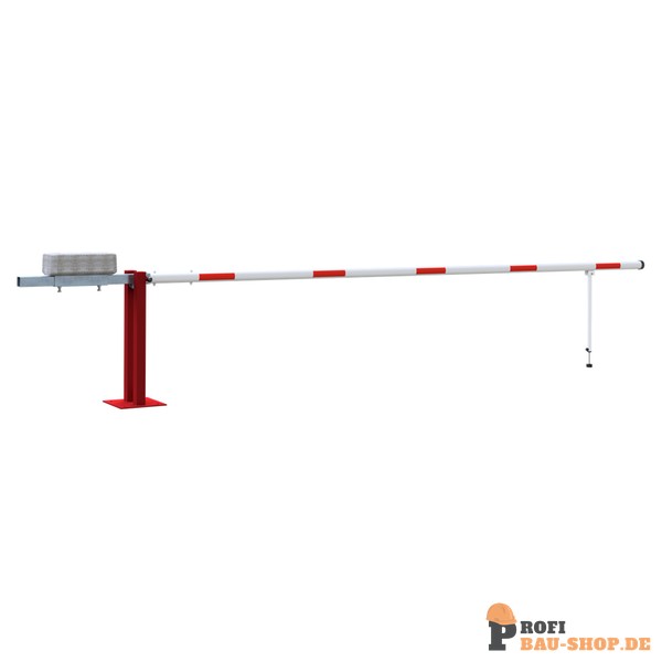 Wegeschranke Hauptstütze: Stahlkonstruktion 70 x 70 mm Vierkantrohr mit Bodenplatte 360 x 360 x 8 mm zum Aufdübeln, inkl. 4 Bohrungen Ø 20 mm für Anker, feuerverzinkt und rot pulverbeschichtet Schrankenbaum: starkwandiges Ø 80 mm Aluminiumrohr mit Gegengewicht, unbeschichtet mit weiß/rot reflektierenden Streifen Pendelstütze: Aluminiumrohr mit Ausgleichsfuß Verschluss: an der Hauptstütze mit Steckbolzen, Arretierung bei geöffneter und geschlossener Schranke Gesamtbreite: lichte Weite + ca. 900 mm Höhe: ca. 950 mm Überflur