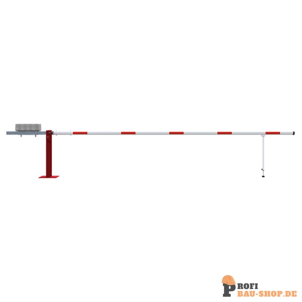 Wegeschranke Hauptstütze: Stahlkonstruktion 70 x 70 mm Vierkantrohr mit Bodenplatte 360 x 360 x 8 mm zum Aufdübeln, inkl. 4 Bohrungen Ø 20 mm für Anker, feuerverzinkt und rot pulverbeschichtet Schrankenbaum: starkwandiges Ø 80 mm Aluminiumrohr mit Gegengewicht, unbeschichtet mit weiß/rot reflektiere
