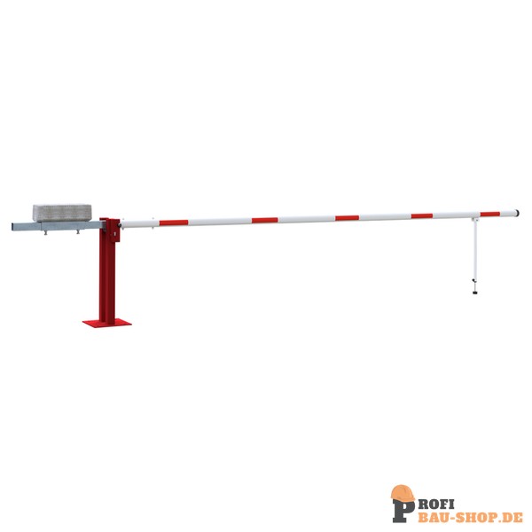 Wegeschranke Hauptstütze: Stahlkonstruktion 70 x 70 mm Vierkantrohr mit Bodenplatte 360 x 360 x 8 mm zum Aufdübeln, inkl. 4 Bohrungen Ø 20 mm für Anker, feuerverzinkt und rot pulverbeschichtet Schrankenbaum: starkwandiges Ø 80 mm Aluminiumrohr mit Gegengewicht, unbeschichtet mit weiß/rot reflektierenden Streifen Pendelstütze: Aluminiumrohr mit Ausgleichsfuß Verschluss: an der Hauptstütze mit Steckbolzen, Arretierung bei geöffneter und geschlossener Schranke Gesamtbreite: lichte Weite + ca. 900 mm Höhe: ca. 950 mm Überflur