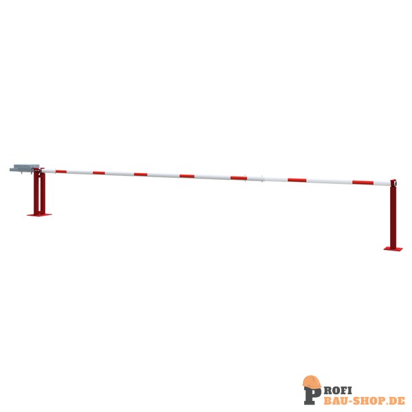 Wegeschranke Hauptstütze: Stahlkonstruktion 70 x 70 mm Vierkantrohr mit Bodenplatte 360 x 360 x 8 mm zum Aufdübeln, inkl. 4 Bohrungen Ø 20 mm für Anker, feuerverzinkt und rot pulverbeschichtet Auflagepfosten: Stahlrohr 70 x 70 mm mit Bodenplatte 220 x 220 x 8 mm inkl. 4 Bohrungen Ø 20 mm für Anker Schrankenbaum: starkwandiges Ø 80 mm Aluminiumrohr mit Gegengewicht, unbeschichtet mit weiß/rot reflektierenden Streifen Verschluss: an der Auflagestütze Arretierung, bei geöffneter Schranke mit Steckbolzen an der Hauptstütze Gesamtbreite: lichte Weite + ca. 900 mm Höhe: ca. 950 mm Überflur