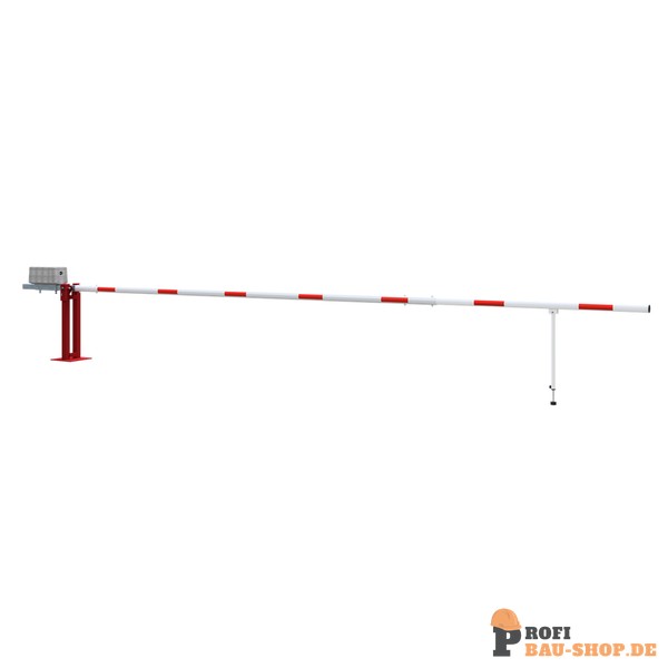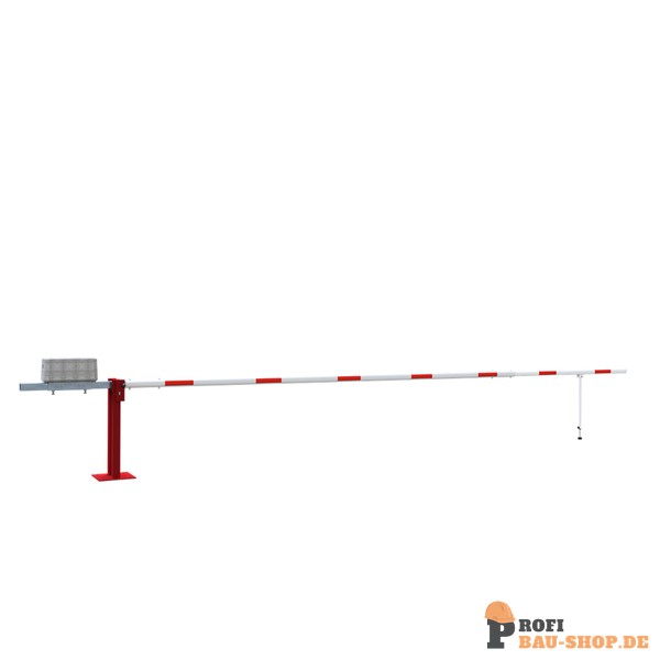 Wegeschranke Hauptstütze: Stahlkonstruktion 70 x 70 mm Vierkantrohr mit Bodenplatte 360 x 360 x 8 mm zum Aufdübeln, inkl. 4 Bohrungen Ø 20 mm für Anker, feuerverzinkt und rot pulverbeschichtet Schrankenbaum: starkwandiges Ø 80 mm Aluminiumrohr mit Gegengewicht, unbeschichtet mit weiß/rot reflektiere