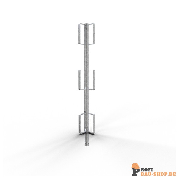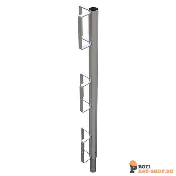 Geländerpfosten aus Ø 48er Standrohr für den Einsatz als Absturzsicherung, mit angeschweißten Bügeln (Innenmaß: 65 x 170 mm) zum Einhängen von Brettern, Standrohr aus Ø 48,3 mm Rundrohr, mit eingeschweißtem Rohrstutzen zum Einstecken in Hülse aus Ø 48,3 mm Rundrohr. Höhe: 1,00 m Überflur geeignet fü