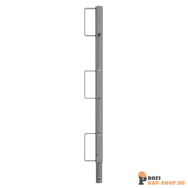 Geländerpfosten aus Ø 48er Standrohr für den Einsatz als Absturzsicherung, mit angeschweißten Bügeln (Innenmaß: 65 x 170 mm) zum Einhängen von Brettern, Standrohr aus Ø 48,3 mm Rundrohr, mit eingeschweißtem Rohrstutzen zum Einstecken in Hülse aus Ø 48,3 mm Rundrohr. Höhe: 1,00 m Überflur geeignet für Faltgerüstbock System, Faltgerüstbock Universal, sowie alle Kurbel-Gerüstböcke