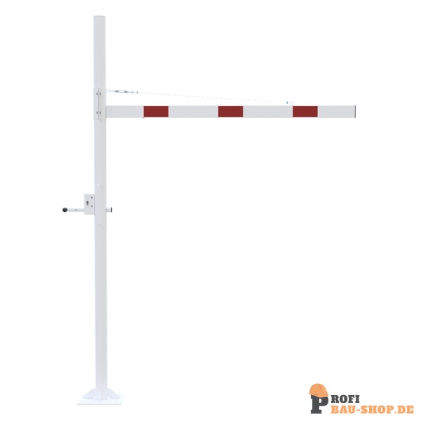 Höhenbegrenzer Horizontal schwenkbar, mit Seilzugverstärkung, Verriegelung geschlossen oder geöffnet mit Bolzen, vorgerichtet für Vorhangschloss oder mit Dreikantverschluss nach DIN 3223 bzw. Profilzylinderschloss, weiß beschichtet mit rot reflektierenden Leuchtstreifen 1-teilig Drehpfostenm aus Stahlrohr Ø 102 mm Querrohr aus Aluminium 100 x 50 mm Durchfahrtshöhe variabel einstellbar ca. 1800 mm - 2800mm Gesamthöhe Überflur ca. 3000 mm
