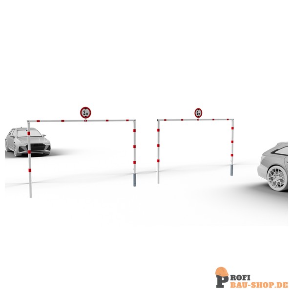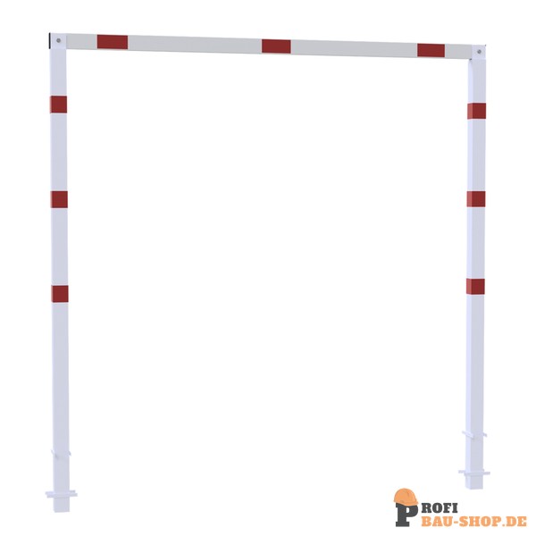 Höhenbegrenzer feuerverzinkt und weiß beschichtet mit rot reflektierenden Leuchtstreifen jeweils 2 Pfosten aus Stahlrohr, 1 Querholm bei einer Gesamthöhe von 3000 mm: 700 mm in den Boden Einbetonieren bei einer Gesamthöhe von 2500 mm: 500 mm in den Boden Einbetonieren