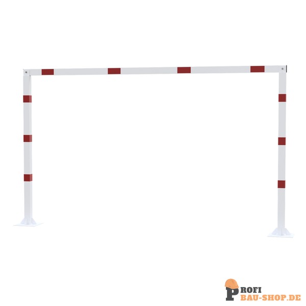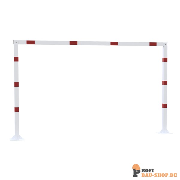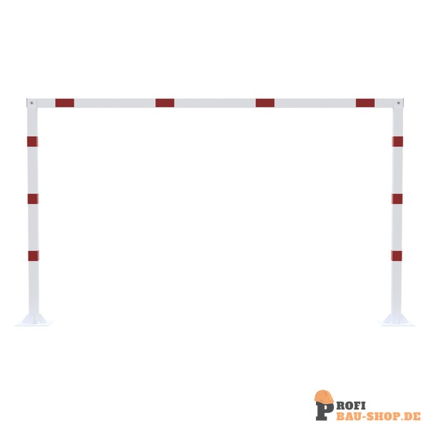 Höhenbegrenzer feuerverzinkt und weiß beschichtet mit rot reflektierenden Leuchtstreifen jeweils 2 Pfosten aus Stahlrohr, 1 Querholm bei einer Gesamthöhe von 3000 mm: 700 mm in den Boden Einbetonieren bei einer Gesamthöhe von 2500 mm: 500 mm in den Boden Einbetonieren