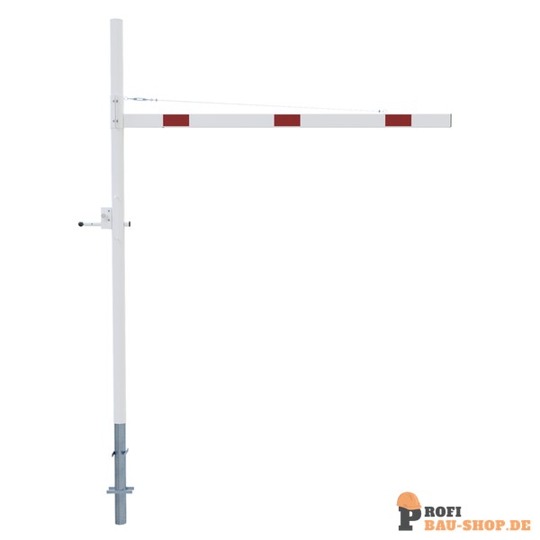 Höhenbegrenzer Horizontal schwenkbar, mit Seilzugverstärkung, Verriegelung geschlossen oder geöffnet mit Bolzen, vorgerichtet für Vorhangschloss oder mit Dreikantverschluss nach DIN 3223 bzw. Profilzylinderschloss, weiß beschichtet mit rot reflektierenden Leuchtstreifen 1-teilig Drehpfostenm aus Stahlrohr Ø 102 mm Querrohr aus Aluminium 100 x 50 mm Durchfahrtshöhe variabel einstellbar ca. 1800 mm - 2800mm Gesamthöhe Überflur ca. 3000 mm