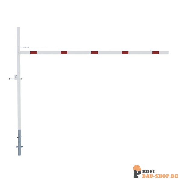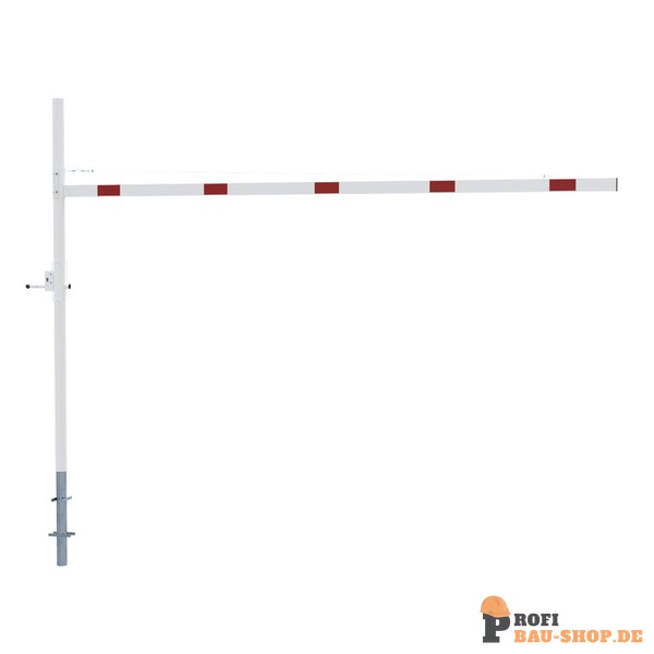 Höhenbegrenzer Horizontal schwenkbar, mit Seilzugverstärkung, Verriegelung geschlossen oder geöffnet mit Bolzen, vorgerichtet für Vorhangschloss oder mit Dreikantverschluss nach DIN 3223 bzw. Profilzylinderschloss, weiß beschichtet mit rot reflektierenden Leuchtstreifen 1-teilig Drehpfostenm aus Stahlrohr Ø 102 mm Querrohr aus Aluminium 100 x 50 mm Durchfahrtshöhe variabel einstellbar ca. 1800 mm - 2800mm Gesamthöhe Überflur ca. 3000 mm