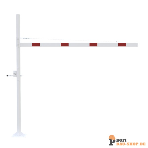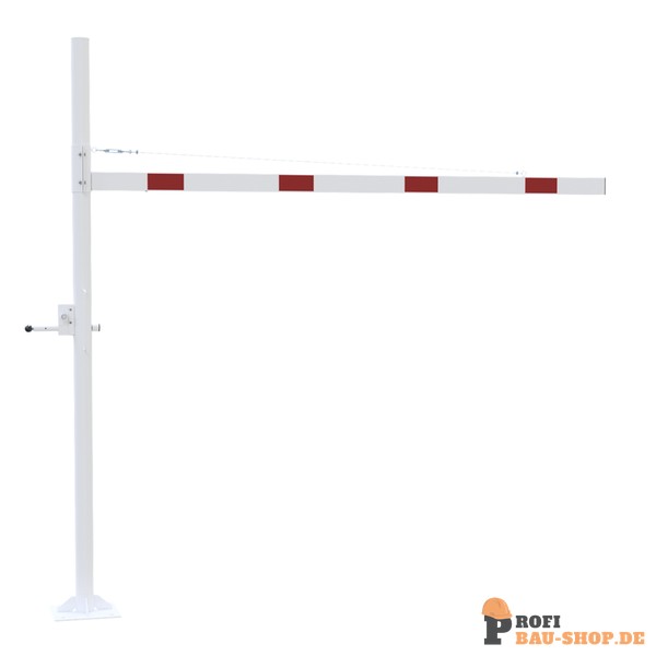 Höhenbegrenzer Horizontal schwenkbar, mit Seilzugverstärkung, Verriegelung geschlossen oder geöffnet mit Bolzen, vorgerichtet für Vorhangschloss oder mit Dreikantverschluss nach DIN 3223 bzw. Profilzylinderschloss, weiß beschichtet mit rot reflektierenden Leuchtstreifen 1-teilig Drehpfostenm aus Stahlrohr Ø 102 mm Querrohr aus Aluminium 100 x 50 mm Durchfahrtshöhe variabel einstellbar ca. 1800 mm - 2800mm Gesamthöhe Überflur ca. 3000 mm