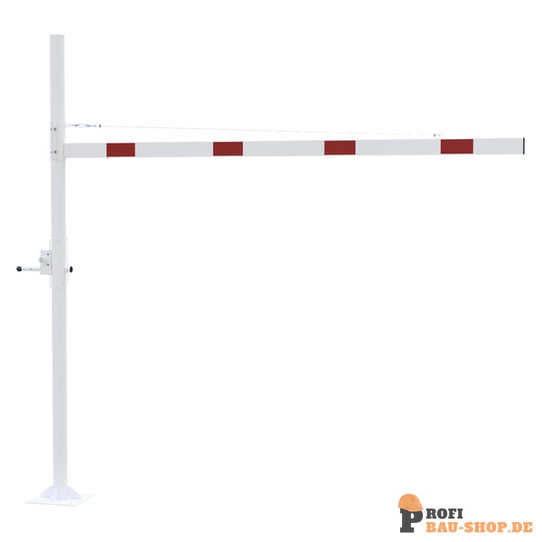 Höhenbegrenzer Horizontal schwenkbar, mit Seilzugverstärkung, Verriegelung geschlossen oder geöffnet mit Bolzen, vorgerichtet für Vorhangschloss oder mit Dreikantverschluss nach DIN 3223 bzw. Profilzylinderschloss, weiß beschichtet mit rot reflektierenden Leuchtstreifen 1-teilig Drehpfostenm aus Sta