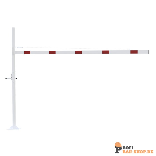 Höhenbegrenzer Horizontal schwenkbar, mit Seilzugverstärkung, Verriegelung geschlossen oder geöffnet mit Bolzen, vorgerichtet für Vorhangschloss oder mit Dreikantverschluss nach DIN 3223 bzw. Profilzylinderschloss, weiß beschichtet mit rot reflektierenden Leuchtstreifen 1-teilig Drehpfostenm aus Sta
