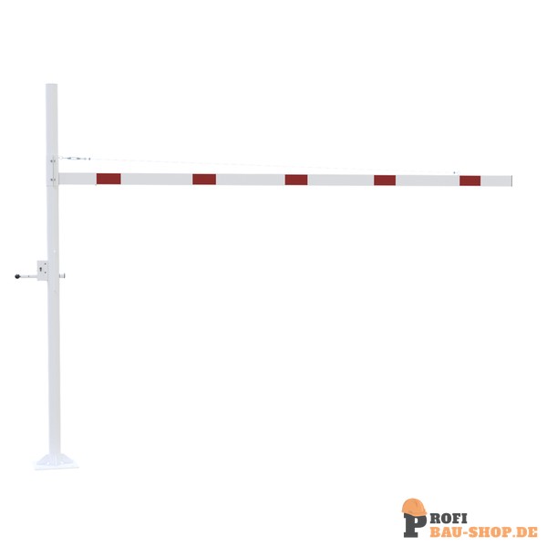 Höhenbegrenzer Horizontal schwenkbar, mit Seilzugverstärkung, Verriegelung geschlossen oder geöffnet mit Bolzen, vorgerichtet für Vorhangschloss oder mit Dreikantverschluss nach DIN 3223 bzw. Profilzylinderschloss, weiß beschichtet mit rot reflektierenden Leuchtstreifen 1-teilig Drehpfostenm aus Stahlrohr Ø 102 mm Querrohr aus Aluminium 100 x 50 mm Durchfahrtshöhe variabel einstellbar ca. 1800 mm - 2800mm Gesamthöhe Überflur ca. 3000 mm