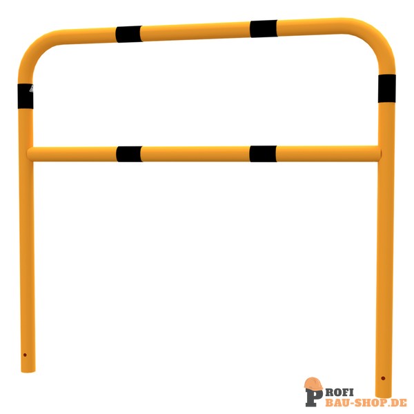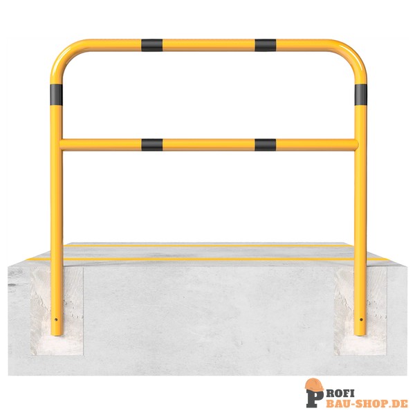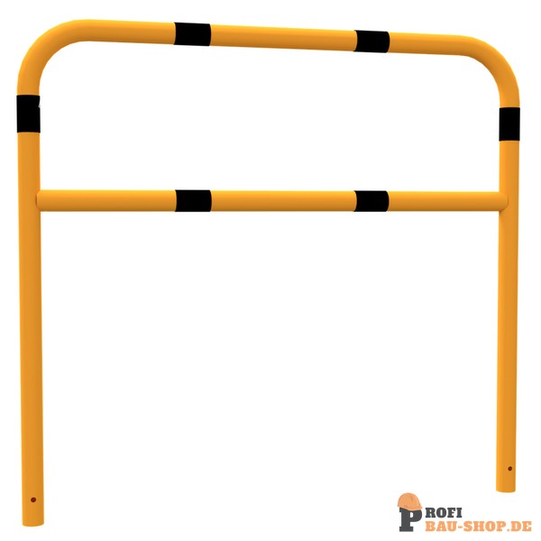Schake Schutzbügel Stahlrohr Ø 60 x 2,5 mm mit Querholm, Gesamtbreite: 1500 mm, Gesamthöhe: 1400 mm, feuerverzinkt und gelb beschichtet mit schwarzen Warnstreifen