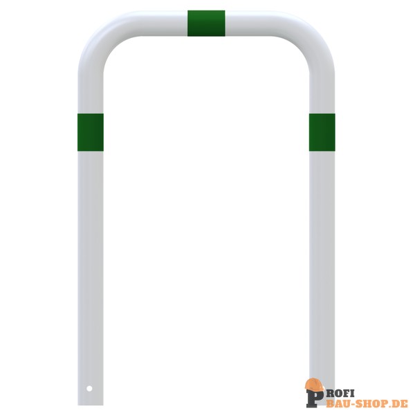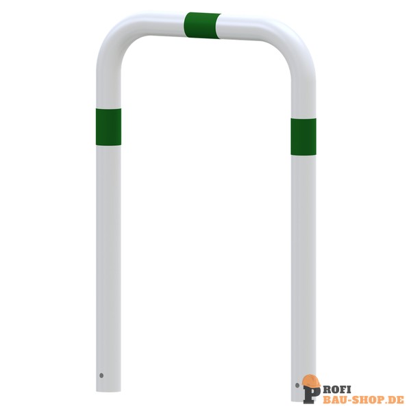 Schake Rammschutzbügel als E-Ladesäulenschutz, zum Einbetonieren, Gesamtbreite: 750mm, Gesamthöhe: 1150mm, feuerverzinkt und weiß pulverbeschichtet mit grün reflektierenden Streifen Folie Typ RA1/A