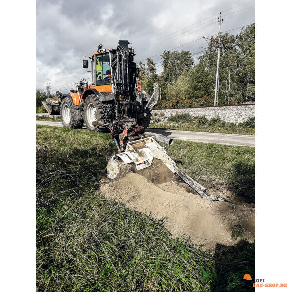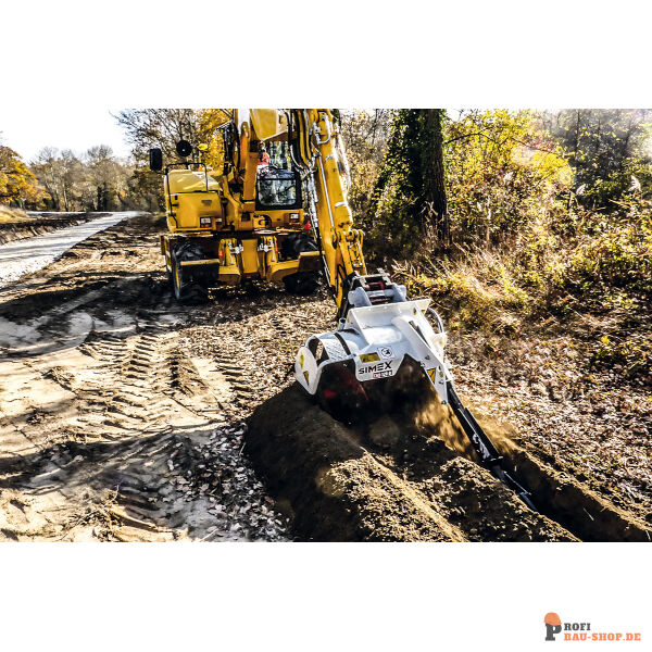 Die SIMEX CHD 120 B mit 150 mm Mix-Kette (Hacken & Zähne) ist die Allround-Lösung für Bagger von 8-15 Tonnen. Sie ermöglicht 1200 mm tiefe Gräben auch in verdichteten oder gemischten Böden.
