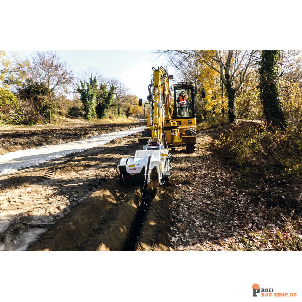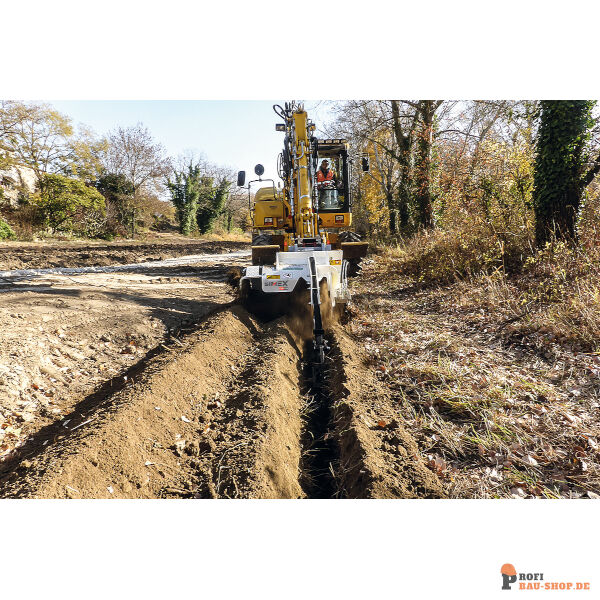 Dank der hohen hydraulischen Leistung und der robusten Bauweise erreicht diese Fräse eine Grabentiefe von 1200 mm. Sie ist damit ideal für anspruchsvolle Tiefbauarbeiten mit Baggern der mittleren Gewichtsklasse. Die bewährte Kombination aus Förderschnecke und Stützschlitten garantiert sauberes und präzises Arbeiten.