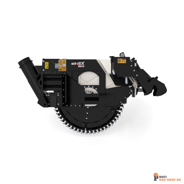 Die SIMEX RWA 500 (5 Leitungen) für High-Flow-Lader mit Direktsteuerung. Hydraulische Seitenneigung und Seitenverschub für vertikale Schnitte bis 500 mm Tiefe, auch an Bordsteinkanten.