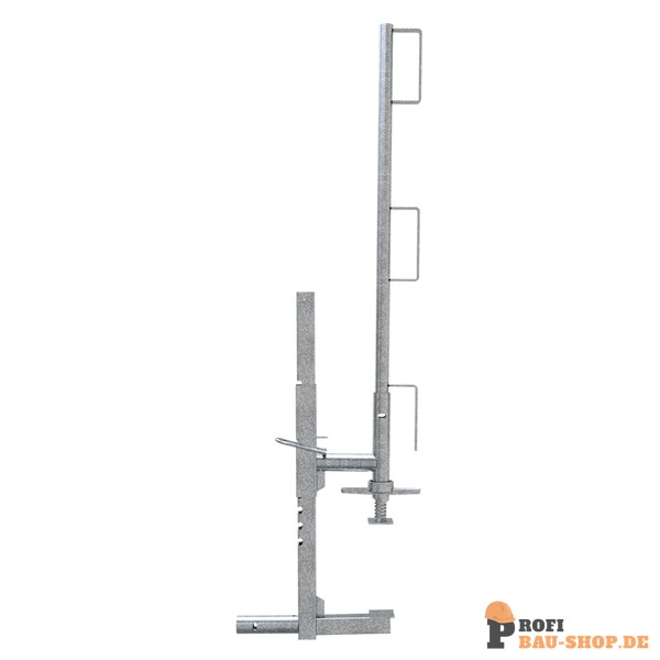 Multisicherungszwinge mit Geländerpfosten bestehend aus: 1 x Multisicherungszwinge (Art.-Nr. 11191) 1 x Multigeländerpfosten (Art.-Nr 11192) Multi-Sicherungszwinge für die Absturzsicherung beim erhöhten Arbeiten, die Zwinge kann auf Decken vertikal oder auf Brüstungen horizontal befestigt werden, Befestigung per Gewinde und Flügelmutter, Grobeinstellung über Klemmen der Kontur des beweglichen Schenkels für eine schnelle Installation, das Einstecken des Geländerpfostens erfolgt erst nach dem Anbringen der Zwinge, für eine bequeme Anwendung, stabile und sichere Stahlkonstruktion. Ausführung: verzinkt Multi-Geländerpfosten zum Einsetzen in Multi-Sicherungszwinge (Art.-Nr. 11191) aus Rundrohr Ø 33,7 mm, Höhe: 1,00 m, mit 3 Haken zum Befestigen von Bordbrettern, mithilfe der Multi-Sicherungszwinge kann eine Brüstungssicherung ebenso wie eine Deckensicherung aufgebaut werden. Ausführung: verzinkt