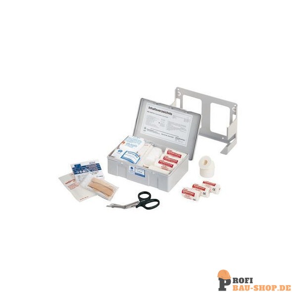 Grauer Kunststoffverbandskasten, mit abnehmbarer, grauer Kunststoff-Wandhalterung. Pflichtausstattung auf Baustellen. Der Verbandskasten ist gefüllt nach DIN 13157-C.