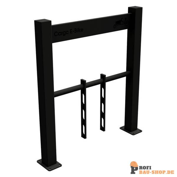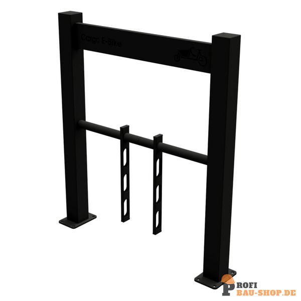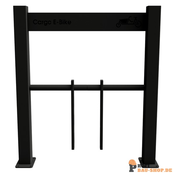 Cargo-Bike Anlehnbügel zum Aufdübeln mit schwenkbaren Haltevorrichtungen zum standfesten sichern der Fahrräder (Cargo-Bikes) mit eingelasertem Logo, feuerverzinkt, beschichtet RAL 9005 Länge: 800 mm