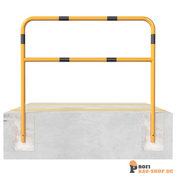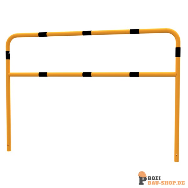 Schake Schutzbügel Stahlrohr Ø 48 x 2,5 mm mit Querholm, Gesamtbreite: 2000 mm, Gesamthöhe: 1400 mm, feuerverzinkt und gelb beschichtet mit schwarzen Warnstreifen