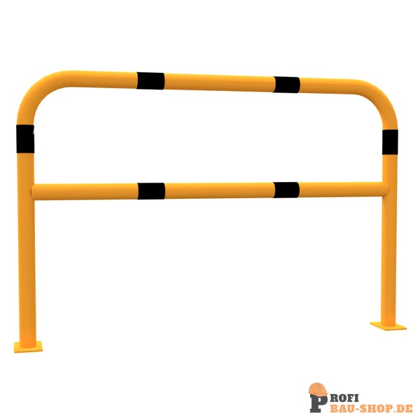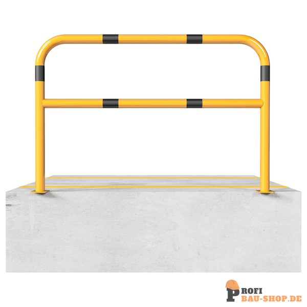 Technische Daten Schutzbügel Stahlrohr Ø 60 x 2,5 mm mit Querholm, Gesamtbreite: 1500 mm, Gesamthöhe: 1000 mm, feuerverzinkt und gelb beschichtet mit schwarzen Warnstreifen