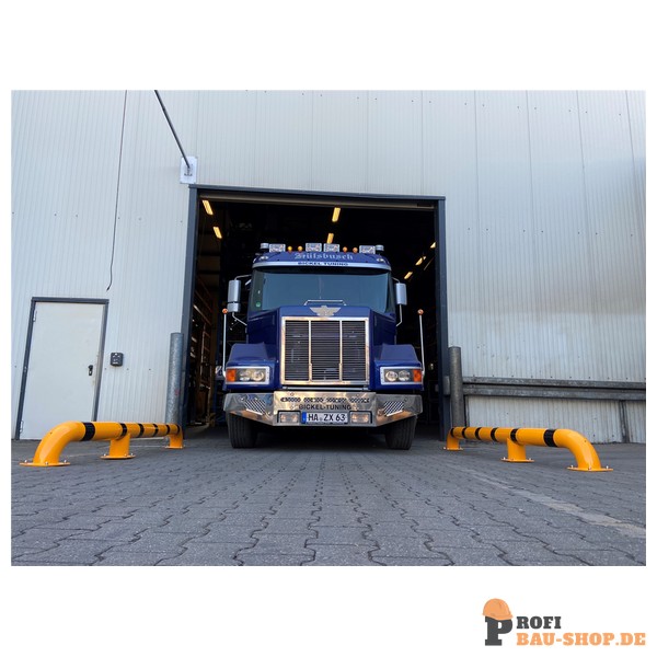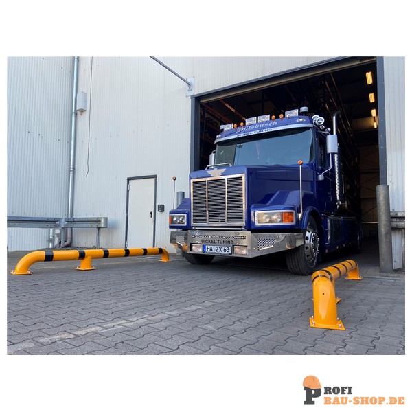 Schake LKW Einfahrhilfe, feuerverzinkt und gelb beschichtet mit schwarzen Streifen, abgewinkelt zur linken Seite, Gesamtlänge: ca. 3000 mm