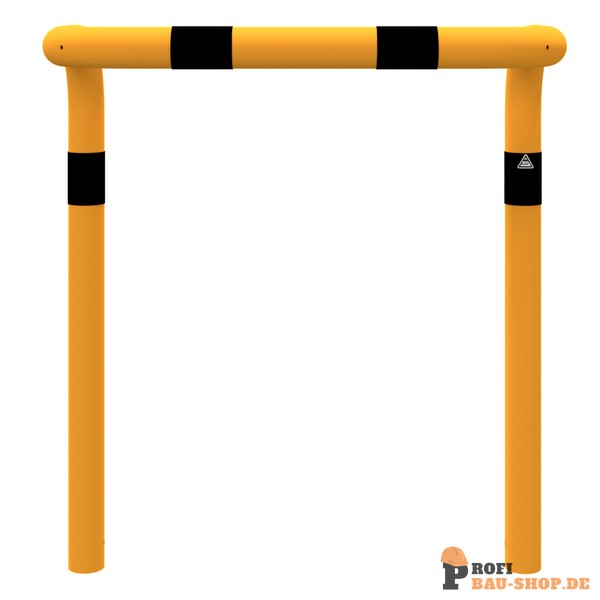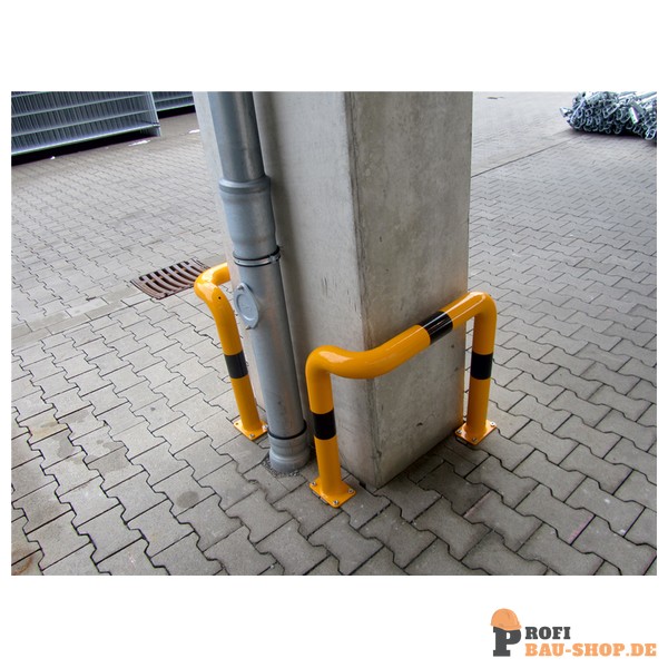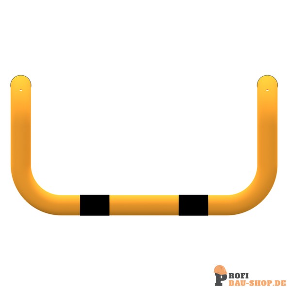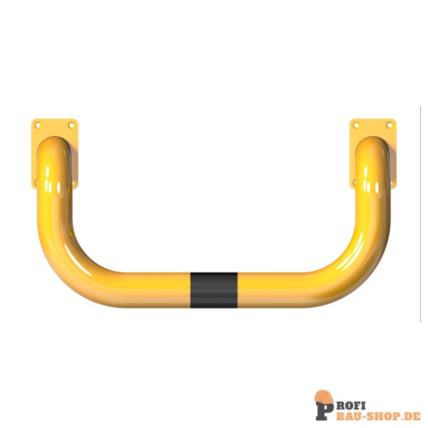 Rammschutzbügel U-Form aus Stahlrohr Ø 76 mm feuerverzinkt, gelb pulverbeschichtet mit schwarzen Warnstreifen mit 2 Standrohren, Gesamttiefe: 450 mm