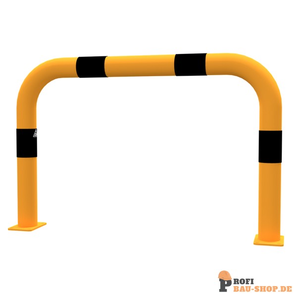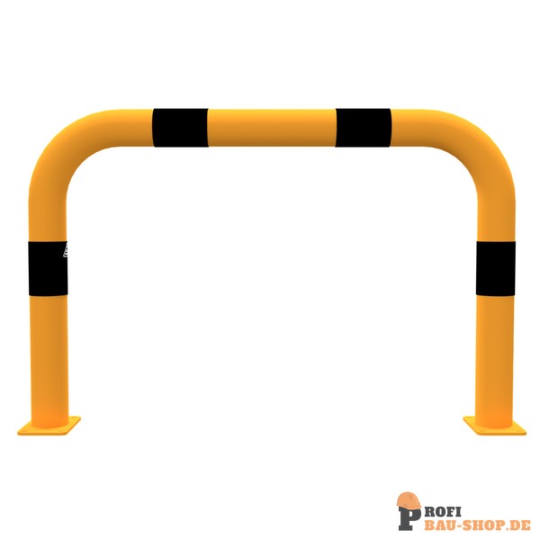 Rammschutzbügel Stahlrohr Ø 76 mm Wirkungsvoller Schutz für den Innen- und Außenbereich, für Lager und Produktion. Arbeitsbereiche und Verkehrswege sichern, Maschinen, Säulen und Regale schützen. Feuerverzinkt, gelb pulverbeschichtet mit schwarzen Warnstreifen.