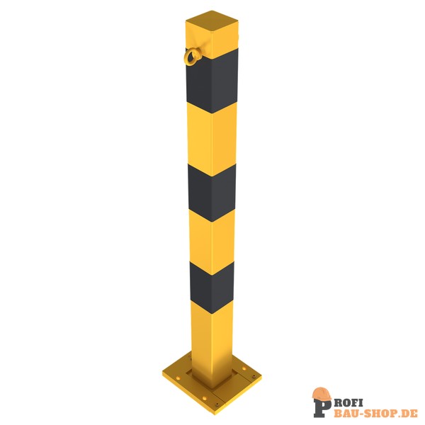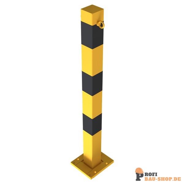 Absperrpfosten mit aufgeschweißter Stahlkappe ca. 1000 mm Überflur feuerverzinkt und gelb beschichtet mit drei schwarzen Streifen lösbar, abnehmbar, für Dübelbefestigung mit Bodenplatte 150 x 180 mm Verriegelung mit einer Innensechskantschraube