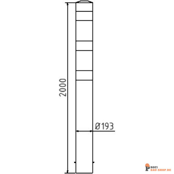 Stahlrohrpoller Ø 193 x 3,6 mm feuerverzinkt und gelb beschichtet mit drei schwarzen Streifen, feuerverzinkt und gelb beschichtet mit drei schwarzen Streifen, Gesamtlänge: 2000 mm, mit aufgeschweißter Stahlkappe