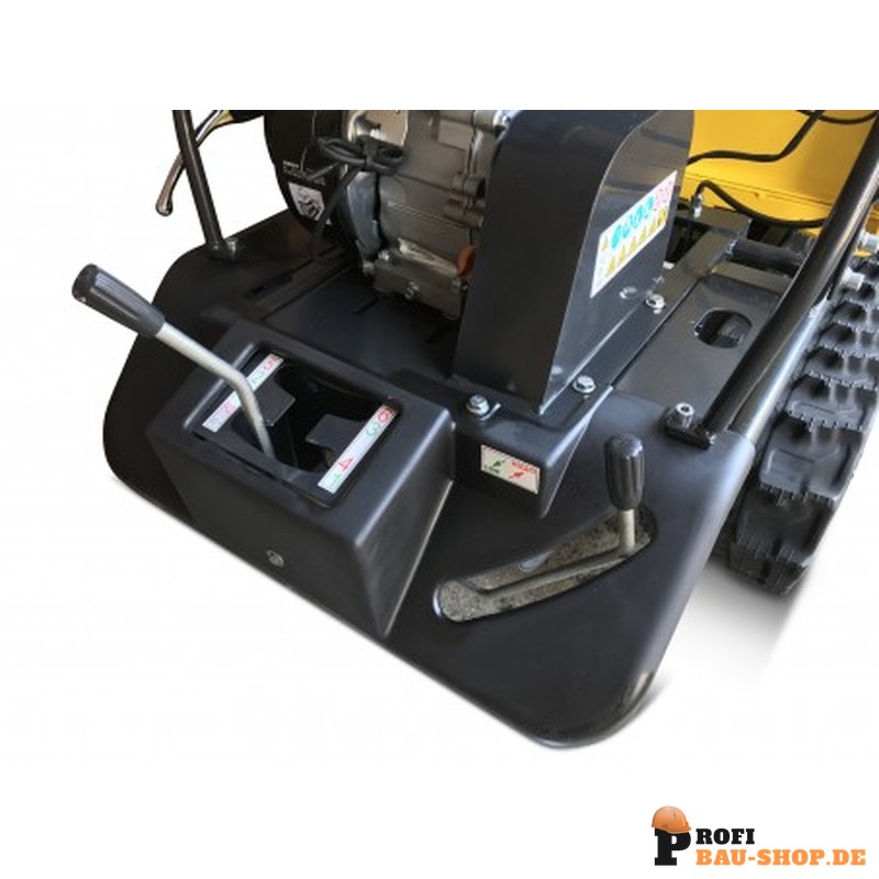 Besonderen Wert wurde auf den Bedienkomfort und die Geländegängigkeit gelegt. Die 110 mm Bodenfreiheit in Kombination mit den robusten Gummiketten inklusive Kettenspanner sorgt für stabilen Vortrieb auch auf schwierigem oder schlammigem Untergrund. Eine serienmäßige Gasdruckfeder unterstützt den Anwender beim Auskippen der Mulde nach vorne, was die körperliche Belastung deutlich reduziert und die Effizienz steigert. Die intuitive Lenkung über Lenkbremsen und die automatische Sicherheitsbremse garantieren zudem ein Höchstmaß an Sicherheit während des täglichen Betriebs.