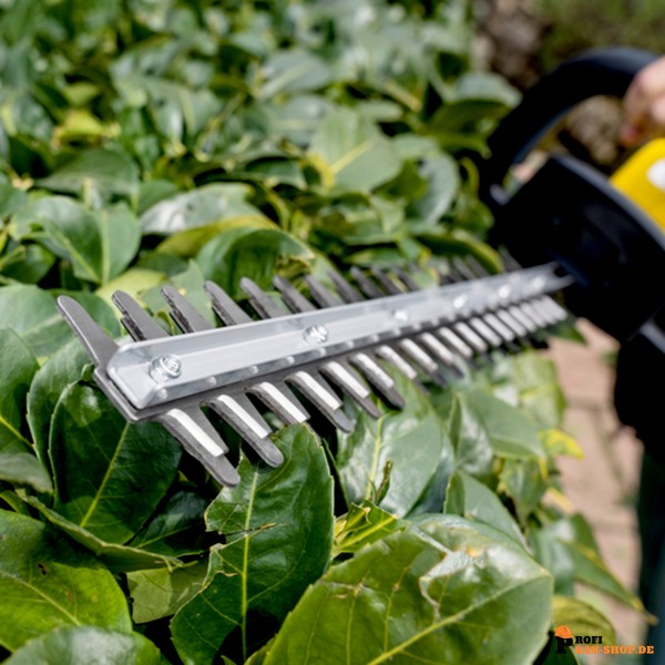 Die akkubetriebene Heckenschere Kärcher HGE 18-45 Battery Set bietet ein komplettes Paket für die komfortable Gartenpflege. Im Set mit Akku und Ladegerät ist sie sofort einsatzbereit und ermöglicht kräfteschonendes Arbeiten dank ihres geringen Gewichts, sodass Schultern und Arme auch bei längeren Einsätzen nicht ermüden. Das diamantgeschliffene Messer sorgt dabei für ein stets präzises Schnittergebnis, während der ergonomisch gestaltete Griff einen sicheren Halt gewährleistet. Eine integrierte 2-Hand-Sicherheitsschaltung verhindert zudem ein unbeabsichtigtes Starten des Geräts, was die Handhabung besonders sicher macht.