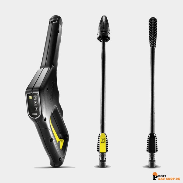 Hochdruckpistole mit Druckstufenanzeige: Verschiedene Strahlrohre ermöglichen 3 Druckstufen für die optimale Reinigung unterschiedlicher Oberflächen. Die Anzeige auf der Hochdruckpistole ermöglicht die einfache Kontrolle der gewählten Druckstufe.