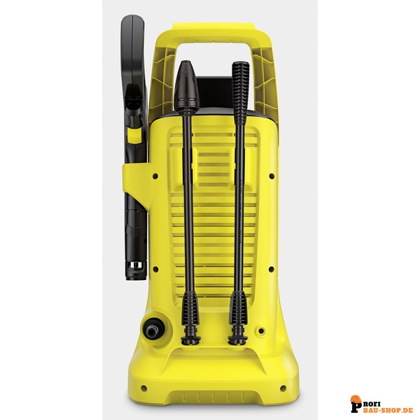 Integrierte Zubehöraufbewahrung: Der Hochdruckschlauch, die Strahlrohre und die Pistole lassen sich platzsparend und ordentlich am Gerät verstauen.